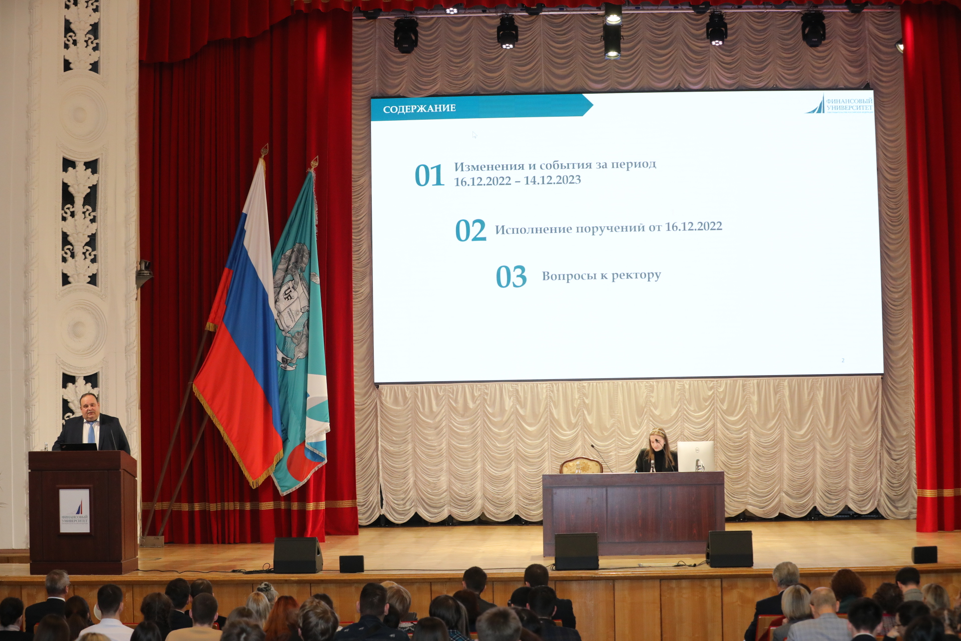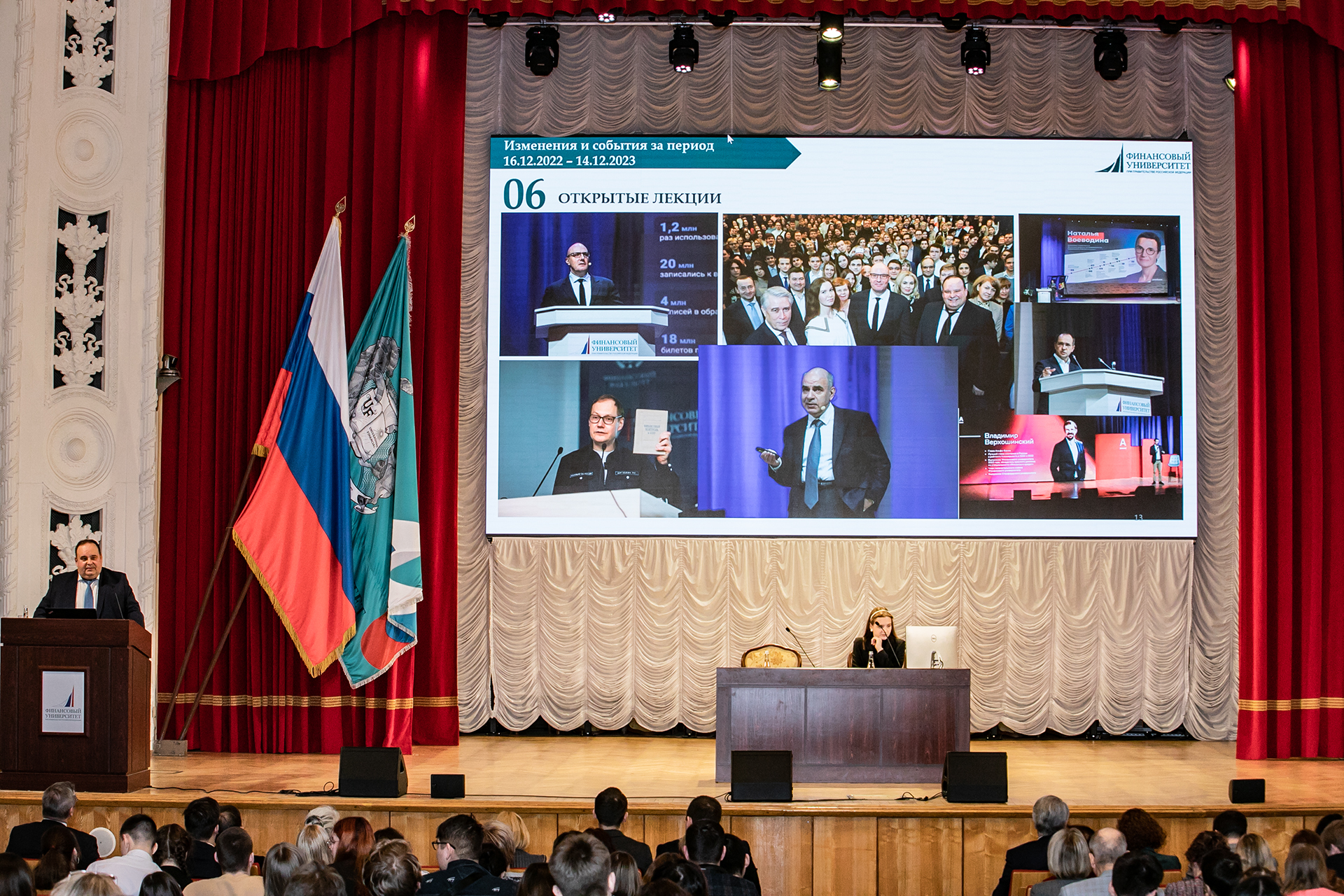 14 декабря 2023 в Большом зале Финансового университета прошел традиционный «Час ректора» – встреча Станислава Евгеньевича Прокофьева со студентами в формате открытого диалога, посвященного знаковым проектам и перспективным направлениям развития университета.